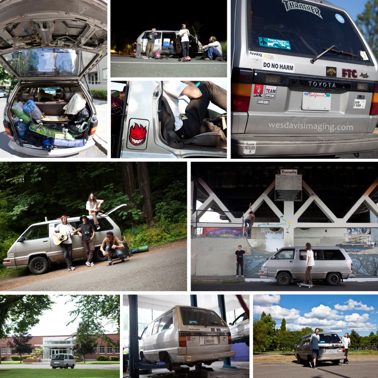 Last month I piled into a spaceship looking van with a bunch of dirty skateboarders and headed for the concrete oases hidden within the lush green and dense forests of Oregon. Our mission was simple; skate as much as possible in route to Troutdale, OR where we would catch the Fleet Foxes live in concert. We had a pretty solid crew to say the least.. Ryan Stark, MVP of the trip was at the helm. Ryan has one of the best styles in skateboarding I have ever seen, the guy is just fun to watch. Ricky Krull held it down in shotgun. Ricky rides for The Company Skateboards and pretty much puts on a show wherever he skates. Mark Dillon holds it down for the Lurk Hard crew and is always coming through with amazing tricks and jokes for days. Yours truly pulled a few tricks out of the old bag and shot the whole adventure.
