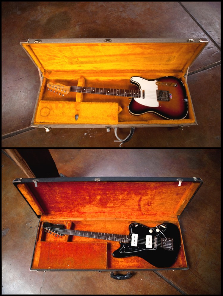 Here’s a couple of JR Halliday’s guitars.. he’s the guitar player from ZuhG. JR likes to get rough with his instruments and Christian is kind enough to nurse them back to health. There’s a Japanese re-issued 1963 Telecaster and an original 1963 Fender Jazz Master. Please be nice to that Jazz Master JR or I might have to place it in some kind of guitar protection program at my house.